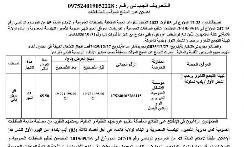 Home/ANEP Annonce/إعلان عن المنح المؤقت للصفقات إعلان عن المنح المؤقت للصفقات DzWatch - ANEP 2623001671 - 09/03/2026 - ¼ page تنزيل PDF