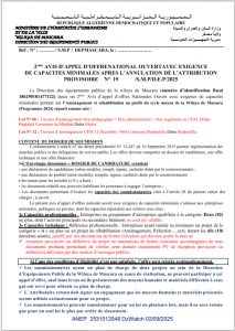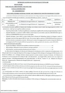ANEP: 2531012048 2eme AVIS APPEL D’OFFER NATIONAL OUVERT AVEC EXIGENCE DE CAPACITES MINIMALS APRES L’ANNULATION DE L’ATTRIBUTION PROFISIORE Client: DERECTION DES EQUIPEMENTS PUBICS MASCARA Type: 2eme AVIS APPEL D’OFFER NATIONAL OUVERT AVEC EXIGENCE DE CAPACITES MINIMALS APRES L’ANNULATION DE L’ATTRIBUTION PROFISIORE Objet: Portant sur l'Aménagement et réhabilitation au profit du cycle moyen - ½ page