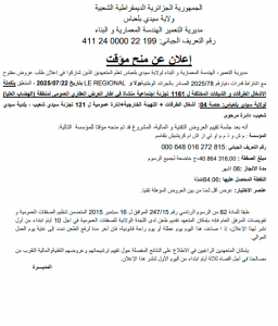 ANEP: 2531012049 اعلان عن منح مؤقت للصفقة Client: مديرية التجهيزات العمومية معسكر Type: اعلان عن منح مؤقت للصفقة Objet: لتهيئة و إعادة الإعتبار لمؤسسات الطور المتوسط (مع التدفئة و التهوية) - ½ page