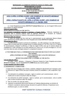 ANEP: 2525007301 AVIS D’APPEL D’OFFRES OUVERT AVEC EXIGENCE DE CAPACITE MINIMALE Client: CENTRE HOSPITALO-UNIVERSITAIRE BENFLIS TOUHAMI BATNA Type: AVIS D'APPEL D'OFFRES OUVERT AVEC EXIGENCE DE CAPACITE MINIMALE Objet: Renouvellement de la literie au CHU BATNA - ¾ page