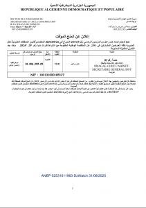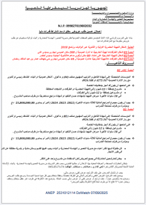 ANEP: 2531012005 إعلان عن إلغاء الإجراءرقم 24المؤرخ في 2025/08/27 Client: ولاية معسكر Type: إعلان عن إلغاء الإجراء رقم 24 المؤرخ في 2025/08/27 Objet: إعلان عن إلغاء الإجراءرقم 24المؤرخ في 2025/08/27 والمتعلـق بأشــغال تهيئة قاعــة قاعة المؤتمرات الأمير خالد - ¼ page