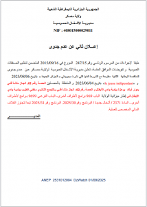 ANEP: 2531011782 إعذار رقم 1 Client: بلدية العزايل Type: إعذار رقم 1 Objet: إعذار للمتعاهد EURL CFC OUEST – ETPTCE بسبب إهمال الورشة وعدم احترام مخطط الأشغال مع منحه… - ¼ page