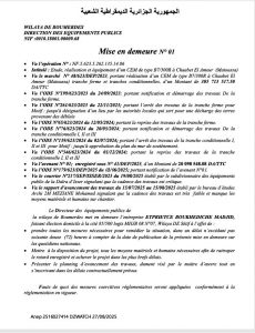 ANEP: 2525007295 1ère MISE EN DEMEURE Client: DIRECTION DES EQUIPEMENTS PUBLICS SETIF Type: 1ère MISE EN DEMEURE Objet: L’entreprise des travaux de construction –TCE-et hydraulique représentée par son gérant MER TALATA NACER sise à… - ¼ page