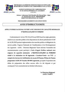ANEP: 2531011824 APPEL D’OFFRES NATIONAL OUVERT AVEC EXIGENCE DE CAPACITES MINIMALES N°56/DRT/AADL/2025 DU 07/08/2025 Client: AADL DIRECTION REGIONALE TIARET Type: APPEL D’OFFRES NATIONAL OUVERT AVEC EXIGENCE DE CAPACITES MINIMALES Objet: Réalisation de 48 logements « Location-Vente » en TCE avec travaux de viabilisation à Naâma (programme… - ¼ page