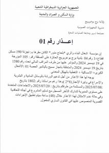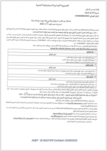 ANEP: 2516027280 إعذار رقم 1 Client: مديرية التجهيزات العمومية لولاية برج بوعريريج Type: إعذار رقم 1 Objet: إعذار لمؤسسة اشغال البناء و الري بلحاج منور من أجل تدعيم الورشة ( المتعلقة بانجاز مسبح… - ¼ page