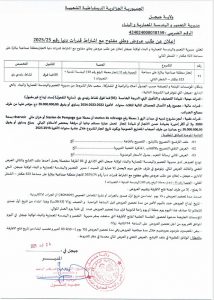 ANEP: 2525007426 إعلان عن المنح المؤقت لطلب عروض مفتوح مع إشتراط قدرات دنيا Client: بلدية أولاد عمار Type: إعلان عن المنح المؤقت لطلب عروض مفتوح مع إشتراط قدرات دنيا Objet: المنح المؤقت لمشروح تهئية حضرية بالمركز البلدي بجانب المسجد العتيق - ¼ page