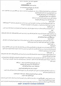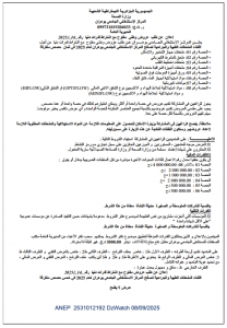 ANEP: 2531011994 :إعلان عن طلب عروض مفتوح مع إشتراط قدرات دنيا رقم 25 في 2025/08/27 Client: ولاية معسكر Type: إعلان عن طلب عروض مفتوح مع إشتراط قدرات دنيا رقم: 25 في 2025/08/27 Objet: دراسة تقييم تنفيذ مخطط تهيئة ولاية معسكر - ½ page