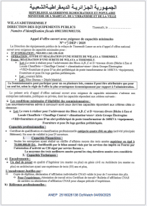 ANEP: 2516028138 APPEL D’OFFER OUVERT AVEC EXIGENCE DE CAPACITES MINIMALS Client: DIRECTION DES EQUIPMENTS PUBLICS TISSEMSILT Type: APPEL D’OFFER OUVERT AVEC EXIGENCE DE CAPACITES MINIMALS Objet: ETUDE ET REALISATION D’UNE SURETE DE WILAYA A TISSEMSILT. - ¾ page
