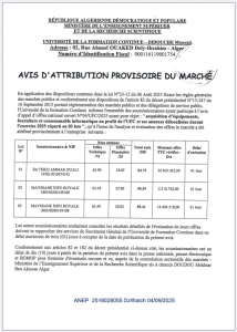 ANEP: 2516028055 AVIS D’ATTRIBUTION PROVISOIRE DU MARCHE Client: UNIVERSITE FORMATION CONTINUE ALGER Type: AVIS D'ATTRIBUTION PROVISOIRE DU MARCHE Objet: acquisition d'équipements, fourniture et consommable informatique au profit de l'UFC - ¼ page